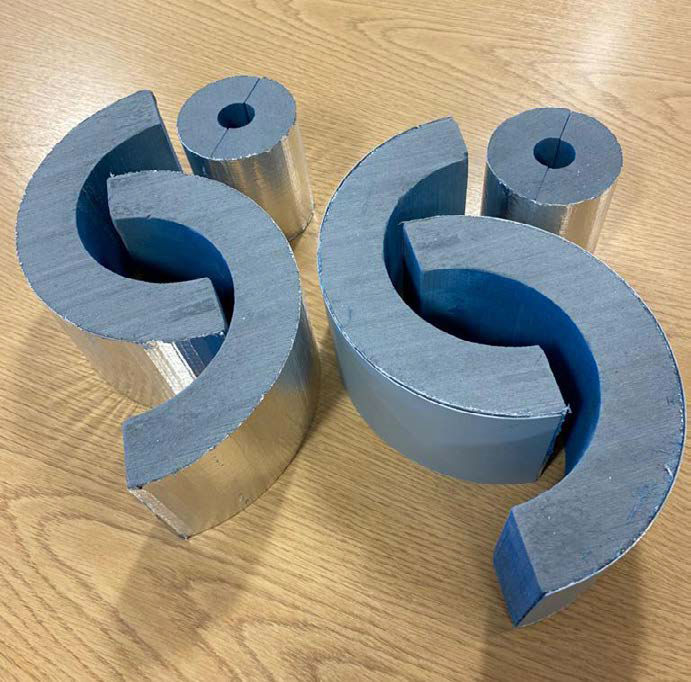 Supaphen pipe supports are supplied with a factory applied aluminium foil vapour barrier and are cut to the required length per the table below. A half metal sleeve (or full if required) is applied as standard from 48mm diameter per the table below. Supaphen pipe supports are bore coated in line with major engineering specifications.